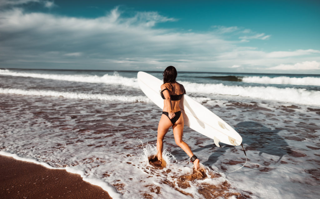 mujer entrando en el agua con tabla de surf