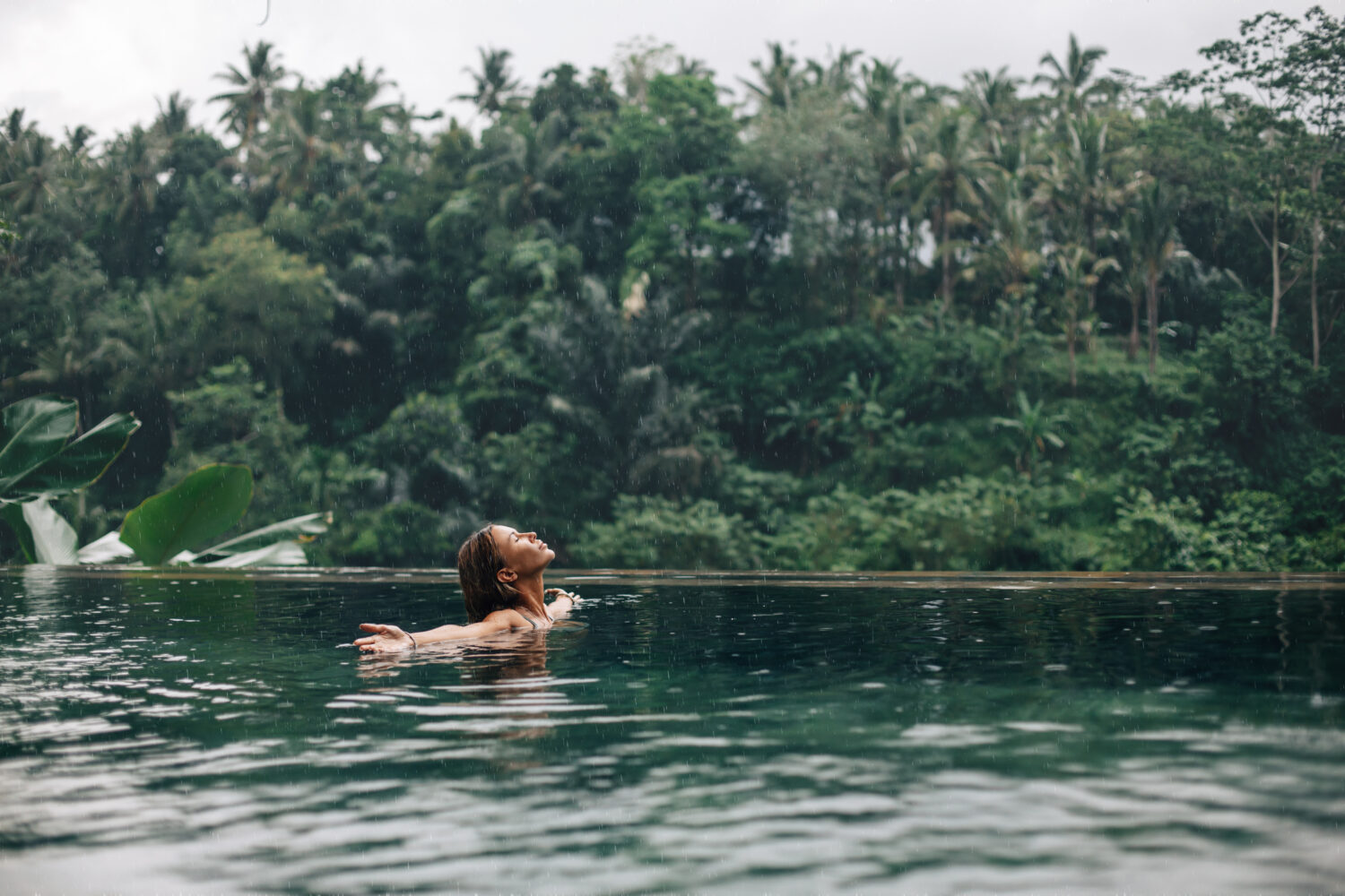 Mujer feliz disfrutando de lluvia tropical caliente cayendo sobre ella mientras nadaba en piscina infinita con vista a la jungla en Ubud, Bali