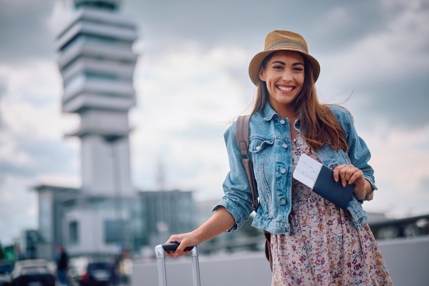 mujer feliz viajando con la maleta y el pasaporte de
