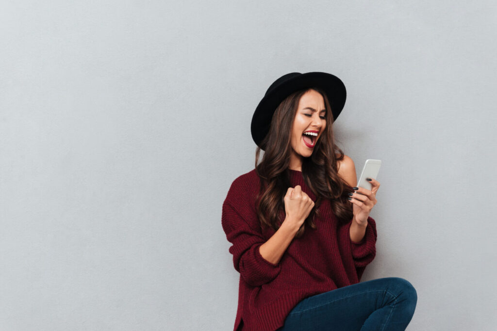mujer guapa con sueter y sombrero con smartphone y regocijo