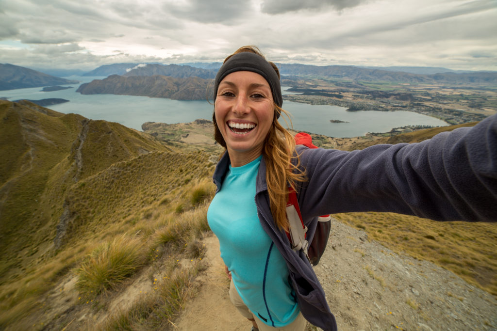Mujer joven capta su éxito de alcanzar la cima de la montaña