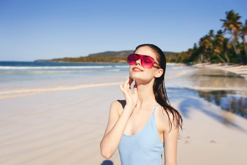 mujer joven en elegantes vasos al aire libre