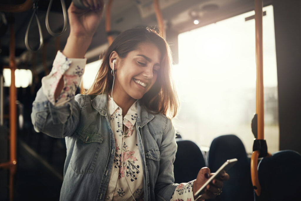 mujer joven sonriendo sola en un autobus escuchando musica en