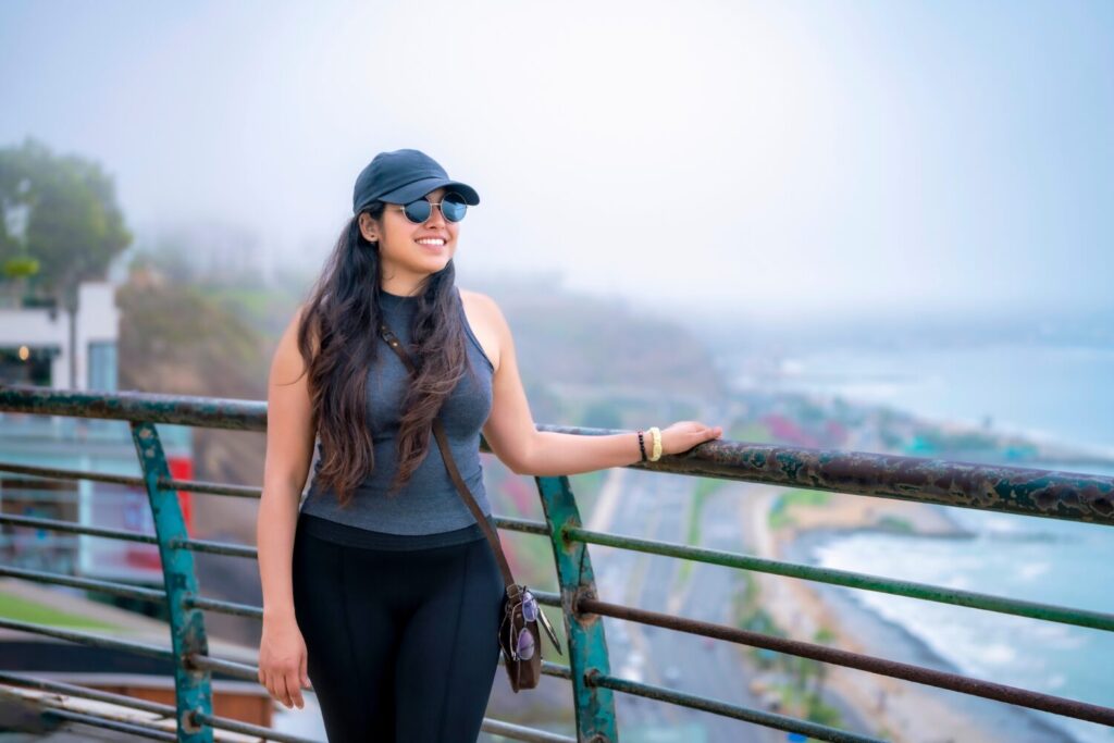 Mujer latina joven sonriendo y relajándose en un banco del parque en Miraflores, Lima, Perú, disfrutando de un agradable día al aire libre.