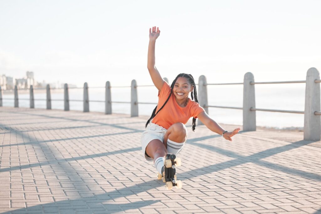 Mujer negra de moda, patinaje sobre ruedas o diversión en la playa, mar o calle de ladrillos oceánicos en Miami, Florida. Retrato de sonrisa, estudiante alegre o lúdico con tendencia, estilo o ropa fresca en truco deportivo de libertad