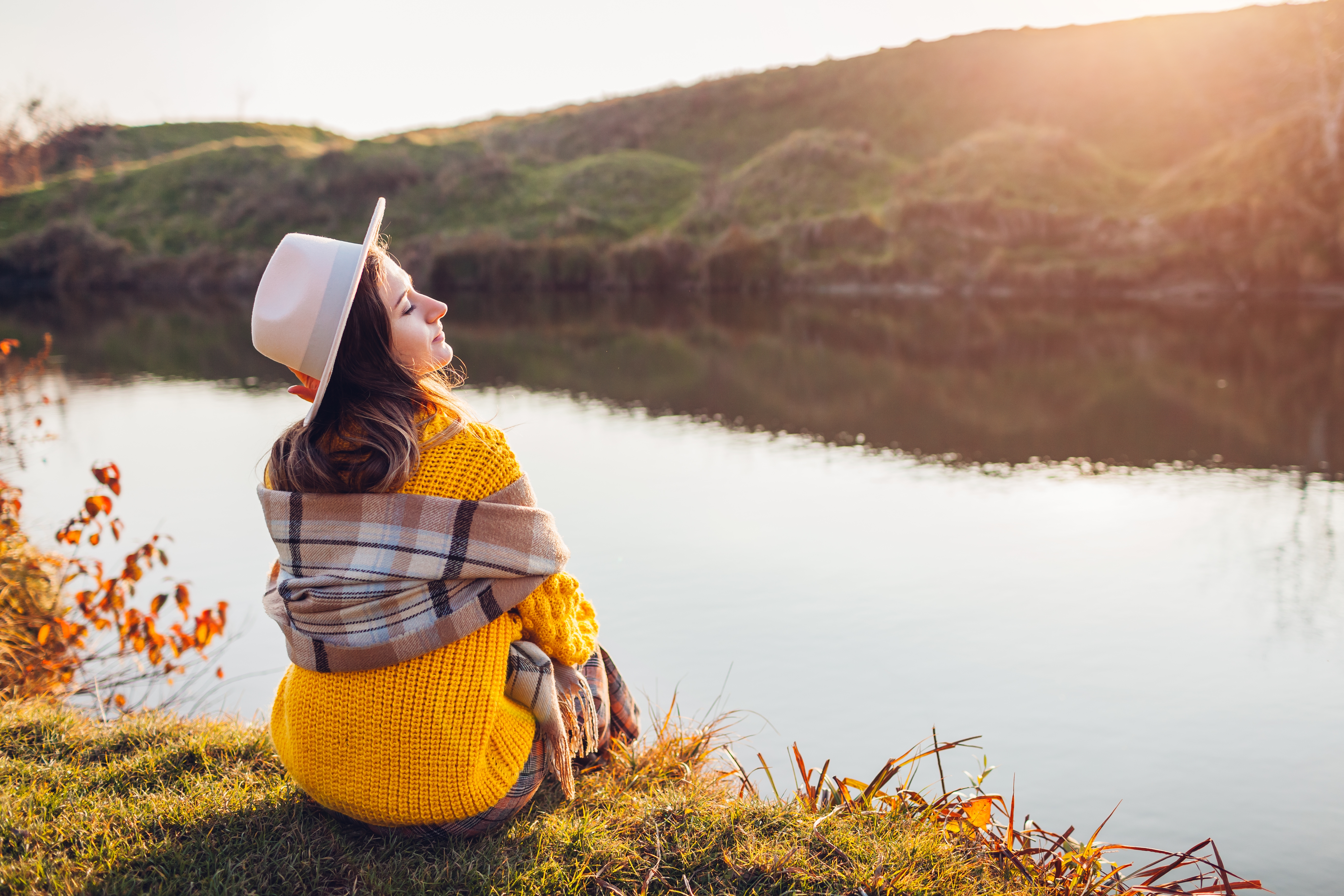 mujer relajandose en el lago otonal al atardecer chica elegante