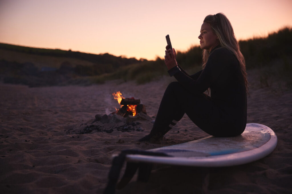 Mujer Sentada En Surfboard Por El Campo De Fuego En La Playa Usando El Teléfono Móvil Mientras El Sol Se Pone A Su Lado