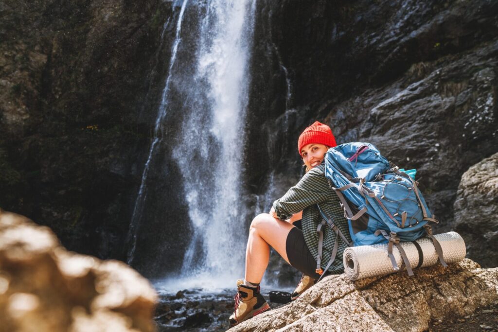 Mujer sonriente con mochila con sombrero rojo vestido con ropas de trekking activas y botas sentadas cerca de la cascada del río de montaña y disfrutando del espléndido poder de la Naturaleza. Viajar, trekking, imagen de concepto de naturaleza
