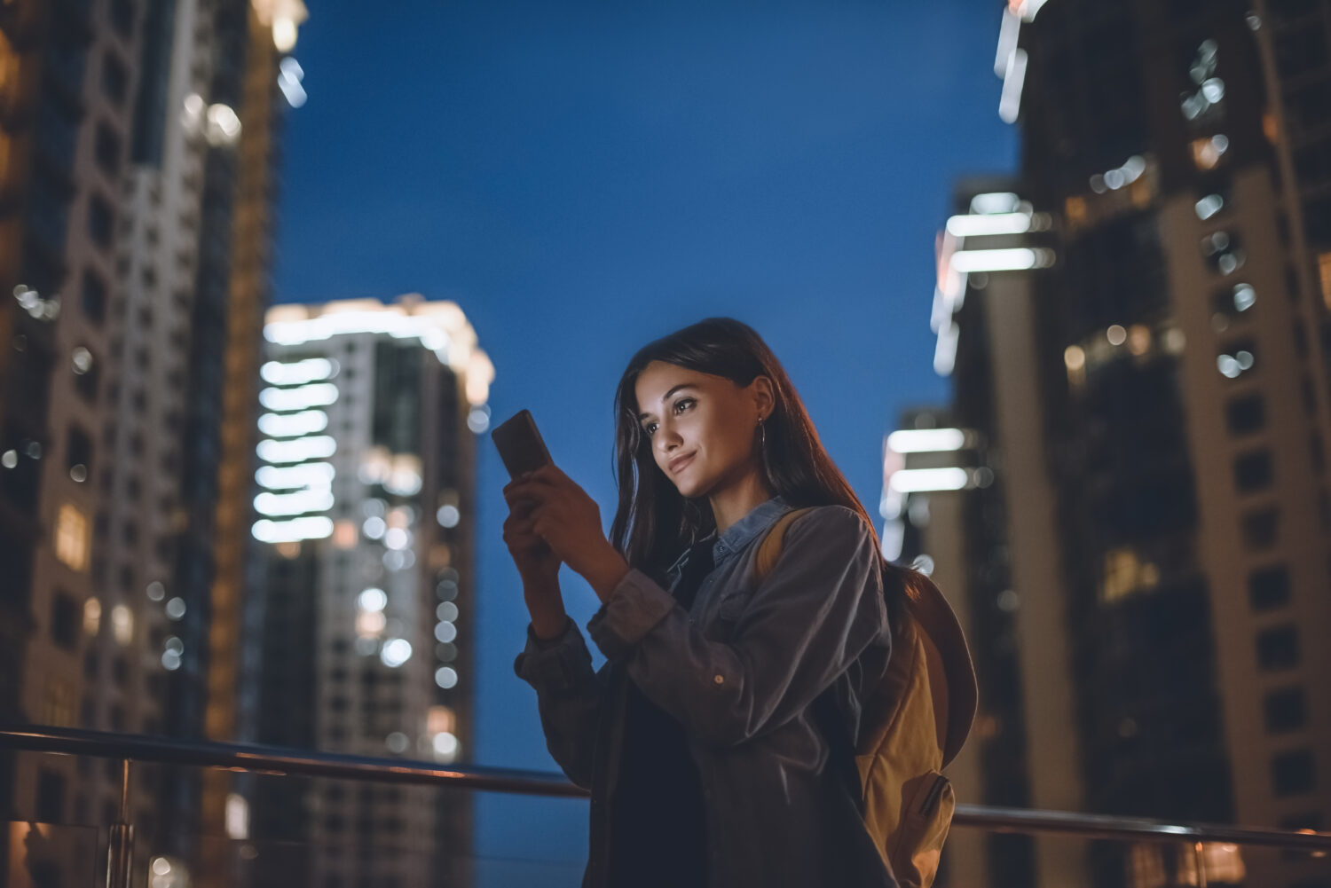mujer sonriente con mochila usando un smartphone en la calle con luces de la ciudad en segundo plano