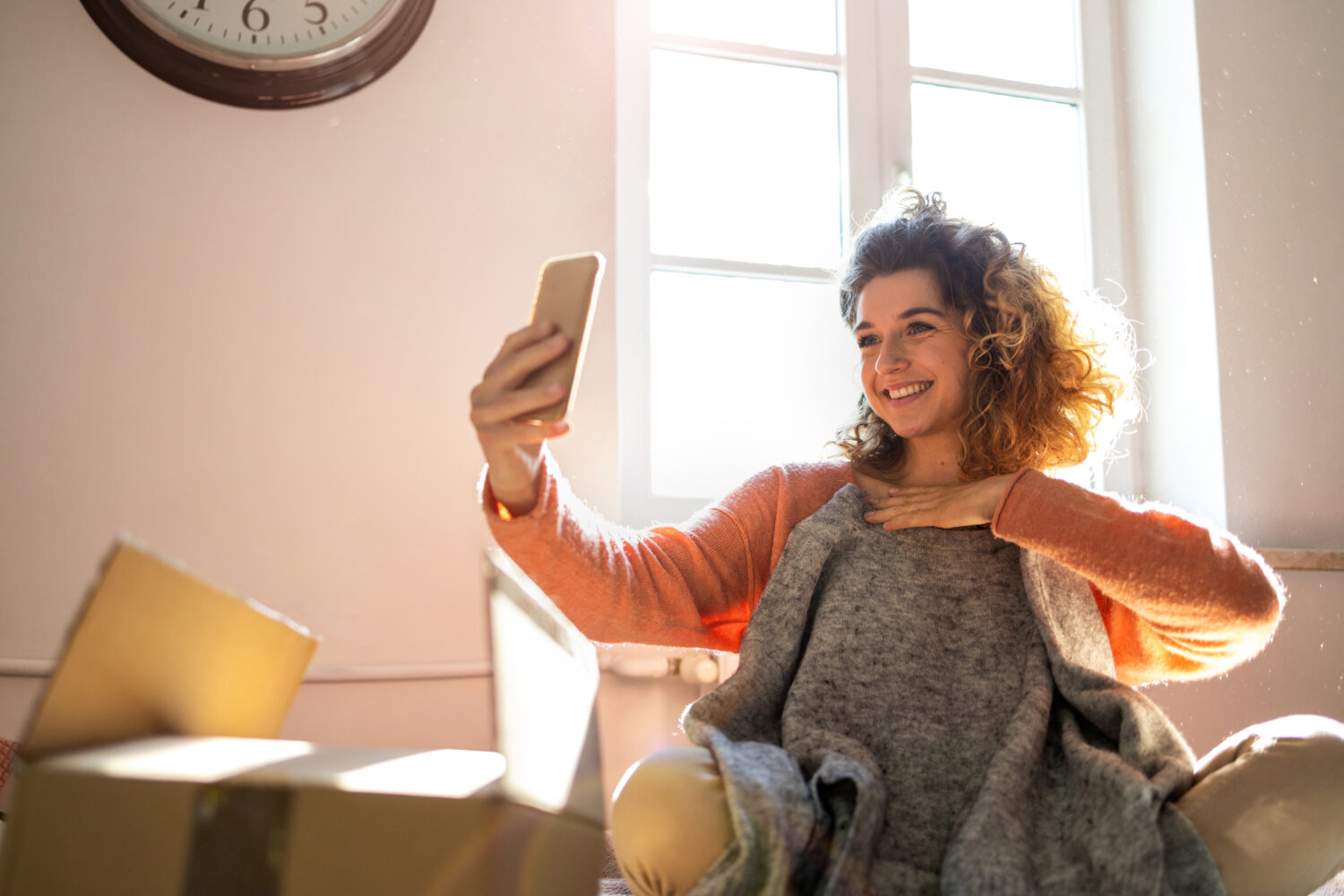 mujer tomando selfie mientras trata ropa en casa ID: 82025 Mujer Tomando Selfie Mientras Trata Ropa En Casa