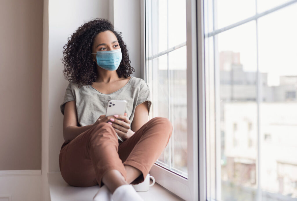 mujer triste sola durante la pandemia del coronavirus usando mascarilla