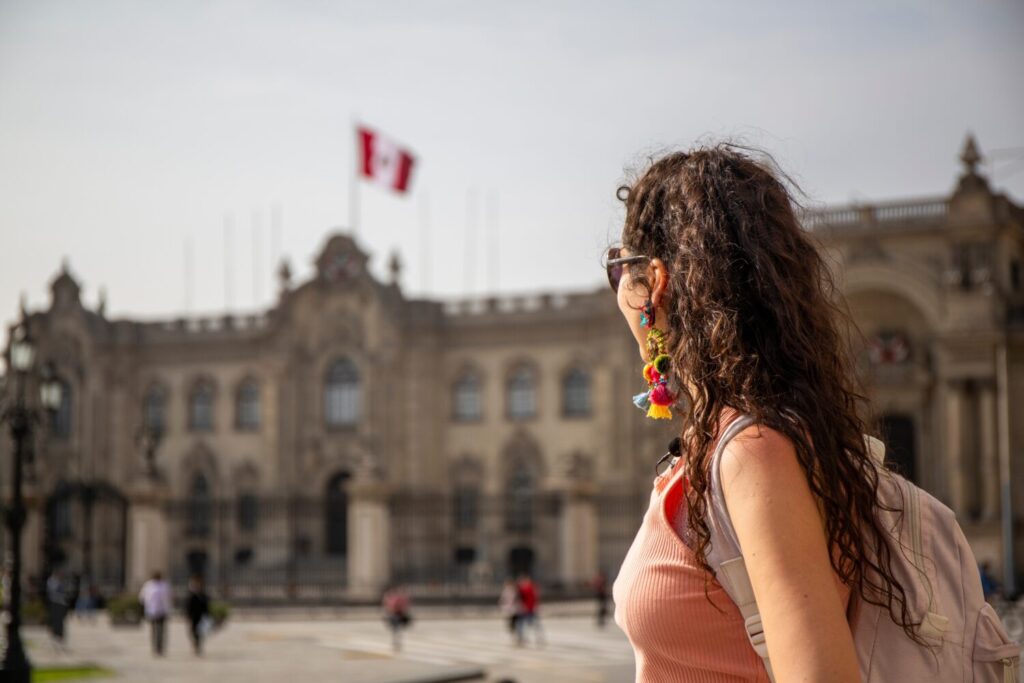 Mujer turista mirando la Catedral de Lima en la plaza principal, Perú en un día nublado