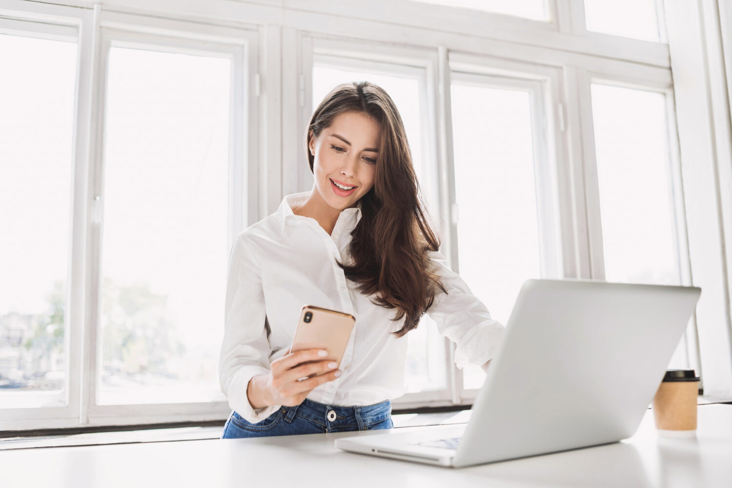 mujer usando laptop y smartphone en la oficina hermosa chica