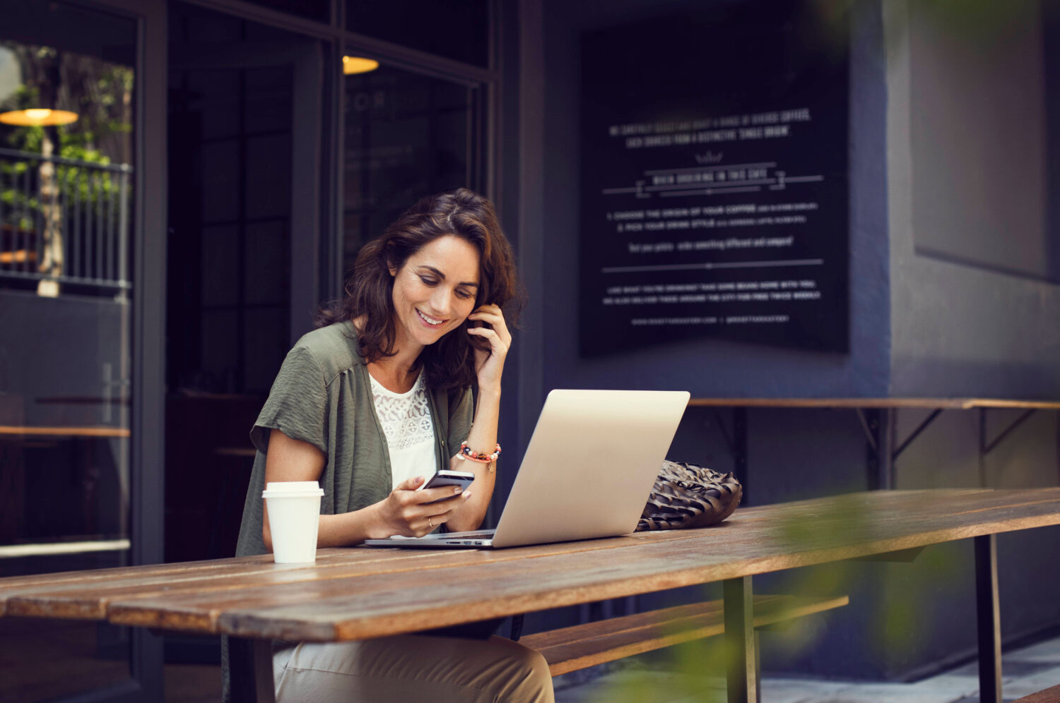 mujer usando su smartphone y su laptop afuera en una ID: 81255 Mujer usando su smartphone y su laptop afuera en una cafetería