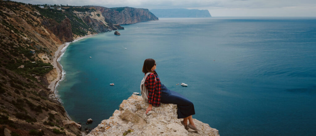 mujer viajando con una mochila turistica a orillas del mar
