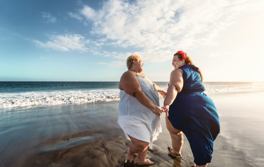 Mujeres felices más grandes bailando en la playa – Niñas con sobrepeso curvando durante sus vacaciones en destino tropical – Concepto de vida de personas más confiables