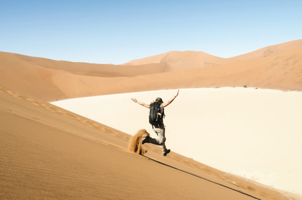 Namibia, Namib Desert, woman running down a dune on the way to Deadvlei