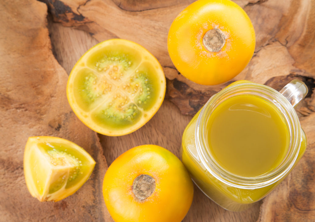 Naranjilla o lulo fruta (lat. Solanum quitoense) en tabla de madera con jugo de naranjilla recién preparado ID: 30637