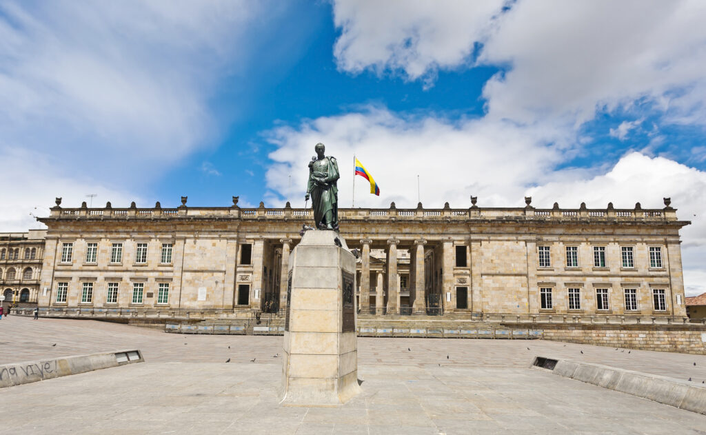 Simon Bolivar Statue In Front Of The National Capitol In Downtown Bogota, Colombia. The Statue Was Made In 1846.