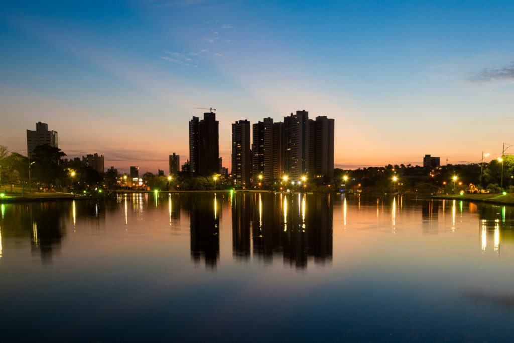 Night view and reflection of buildings in the lake of the park of Nations, City of Campo Grande, Brazil