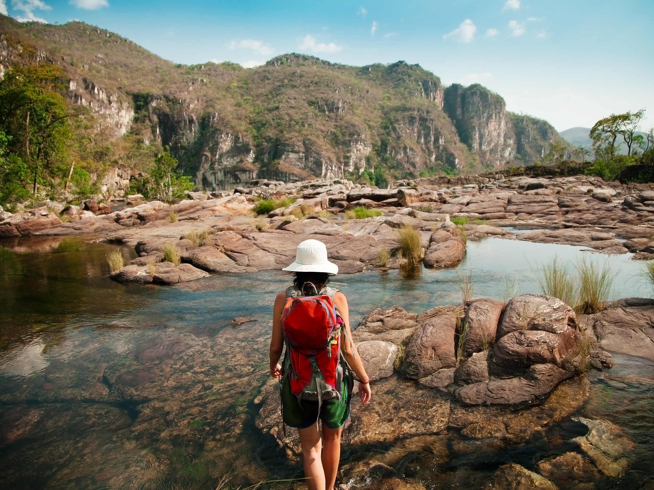 Niña en una caminata por los ríos y las montañas de Chapada dos Veadeiros – mochila roja