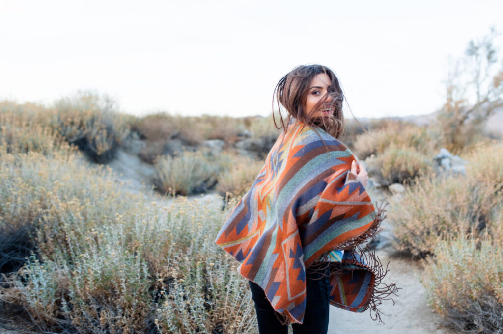 Niña hipster de aspecto gitano, joven viajero en la naturaleza del desierto en Coachella Valley, California, EE.UU.
