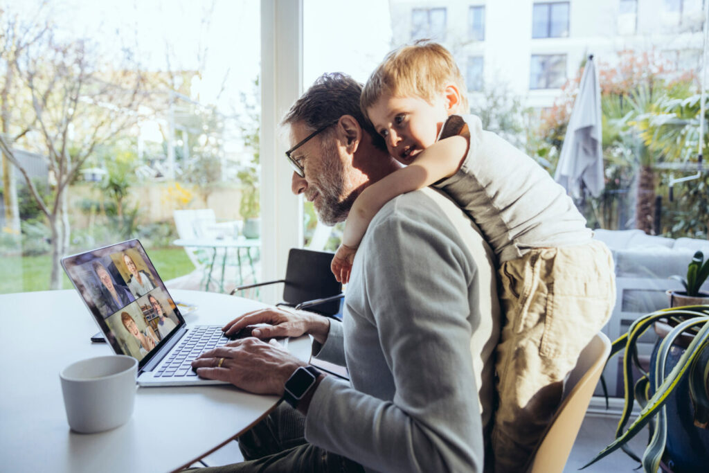 ninito abrazando a padre desde atras mientras trabaja desde casa ID: 81281 Niñito abrazando a padre desde atrás- mientras trabaja desde casa
