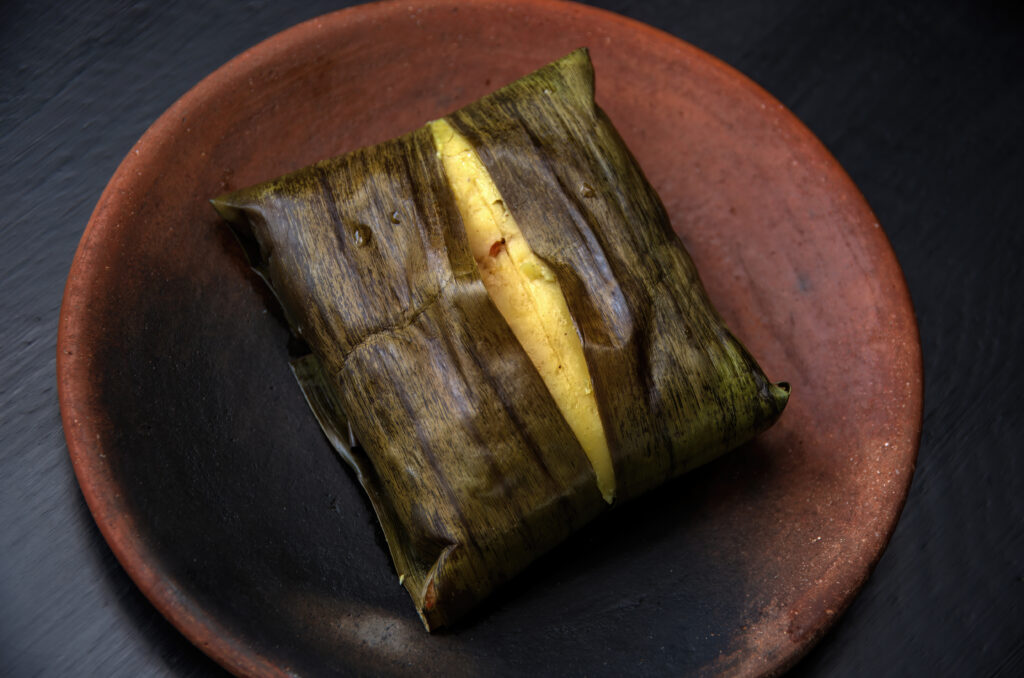 Oaxacan-style tamal de rajas y queso (tamale with sautéed poblano peppers and cheese) steamed in a banana leaf on a clay plate on an outdoor cafe table