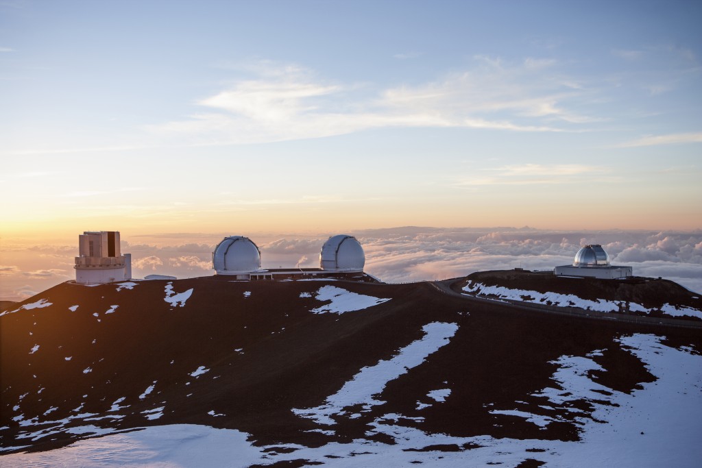 Observatory and silos on snowy mountaintop, Kilauea, Hawaii, United States