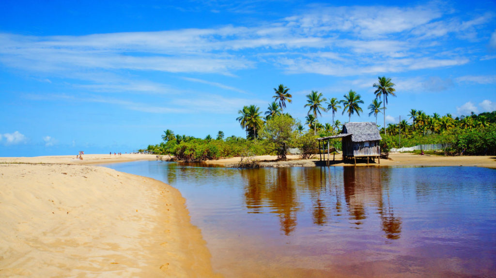 Old fishermen’s house on the river at beautiful sandy beach with palm trees in Trancoso, near Porto Seguro, Bahia, Brazil