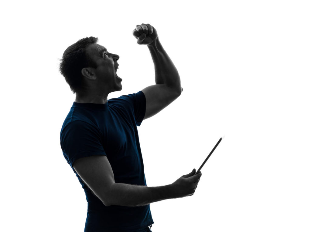 one caucasian man holding digital tablet happy joy in silhouette on white background