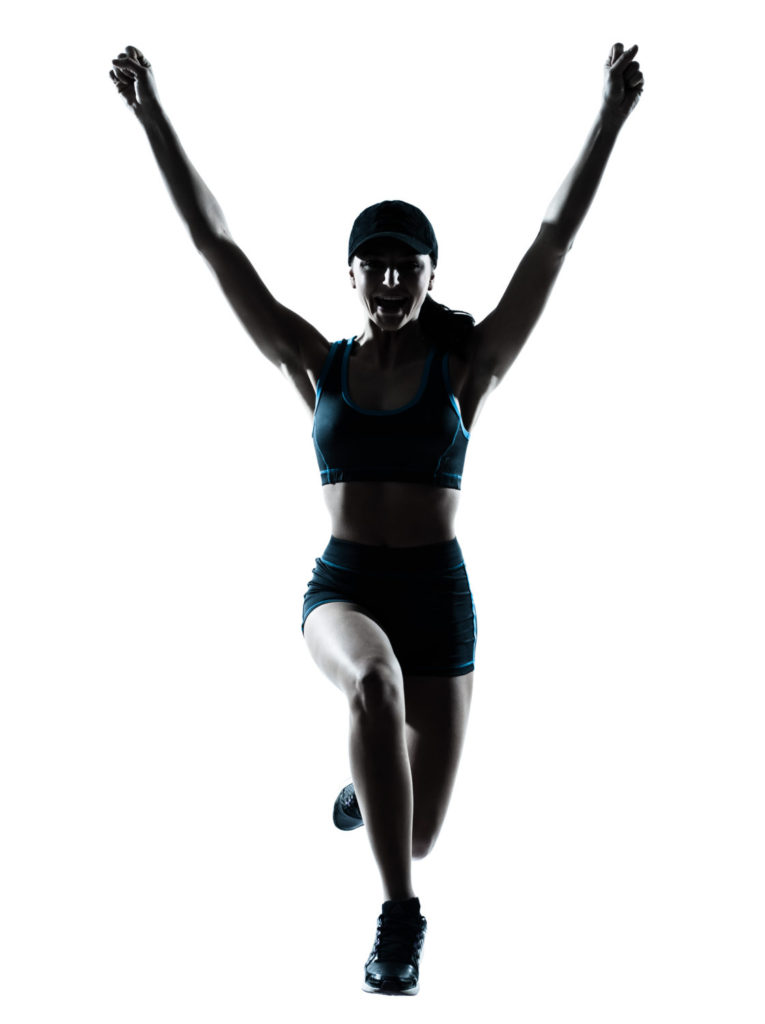 one caucasian woman runner jogger jumping happy jumping in silhouette