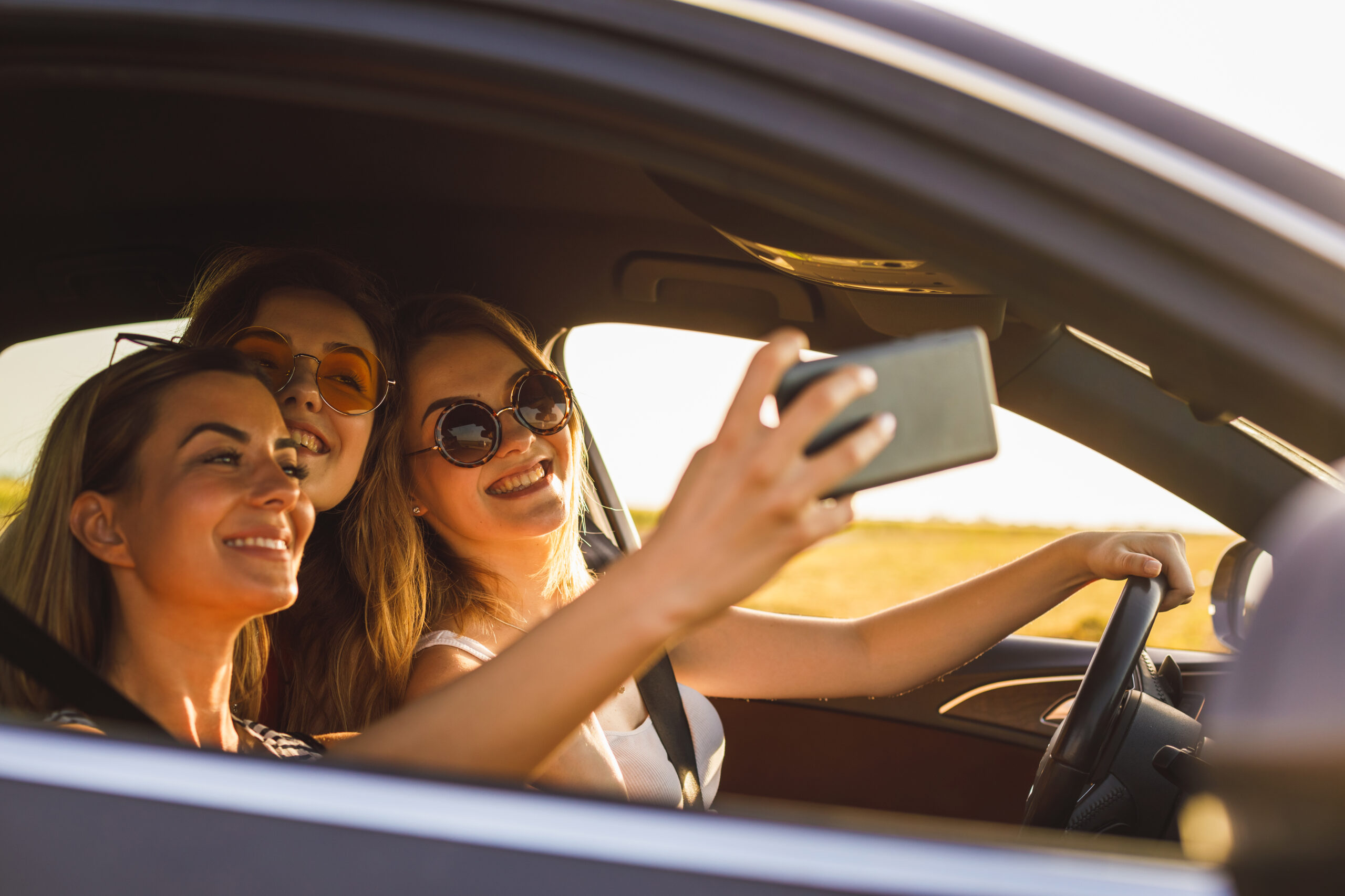 Candid shot through window of front passenger seater where three happy adventurous women are taking a selfie before driving to explore new places together during a road trip.