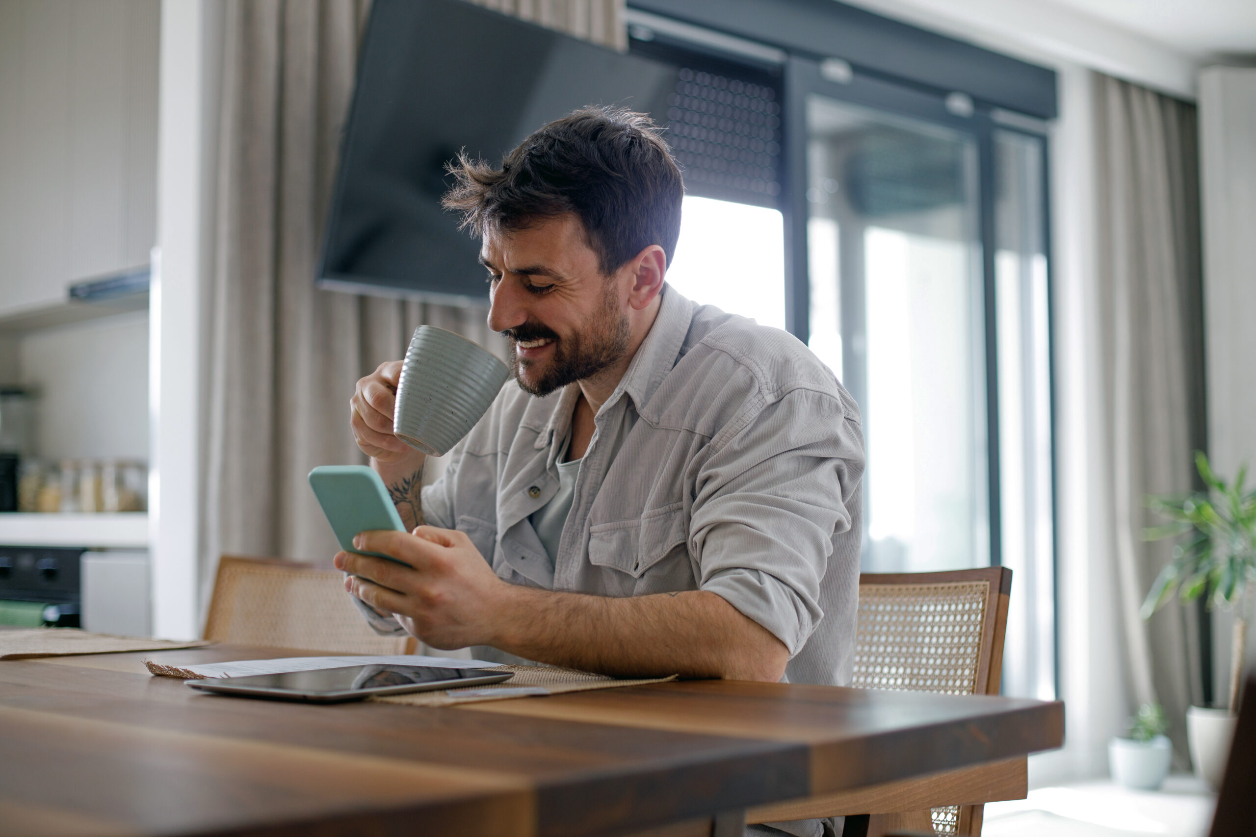 Handsome man with laptop and credit card at home, portrait. Mid adult man holding credit card in front of laptop and smiling.