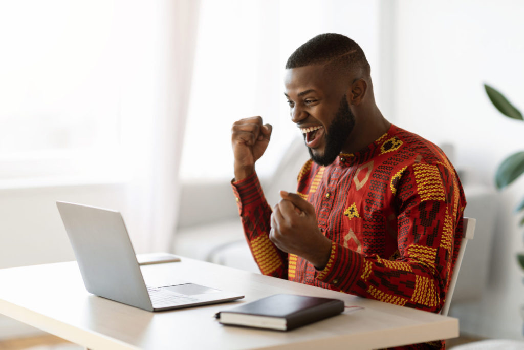 online win joyful black man in traditional african shirt celebrating