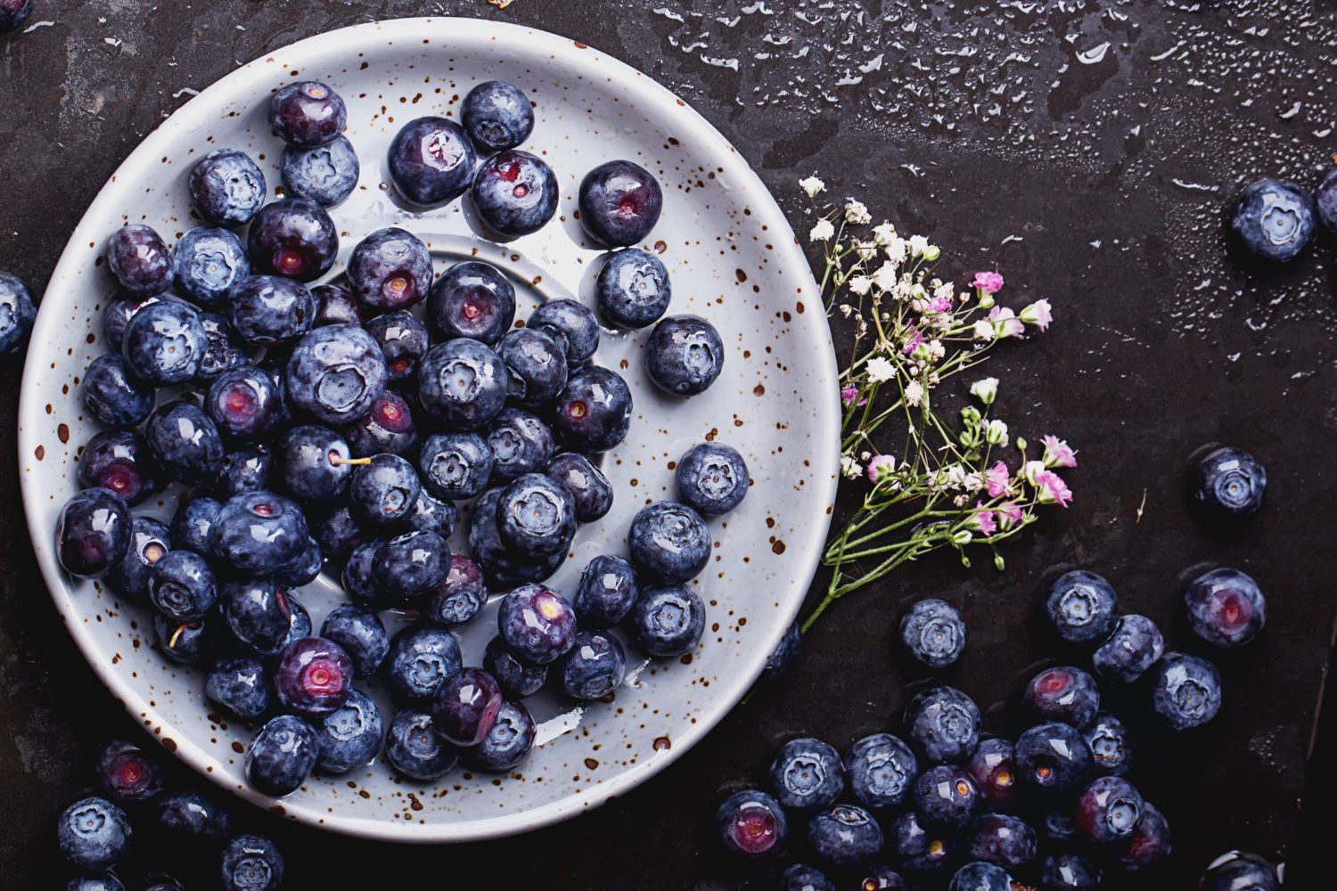 organic blueberries served in the grey vintage cup over a