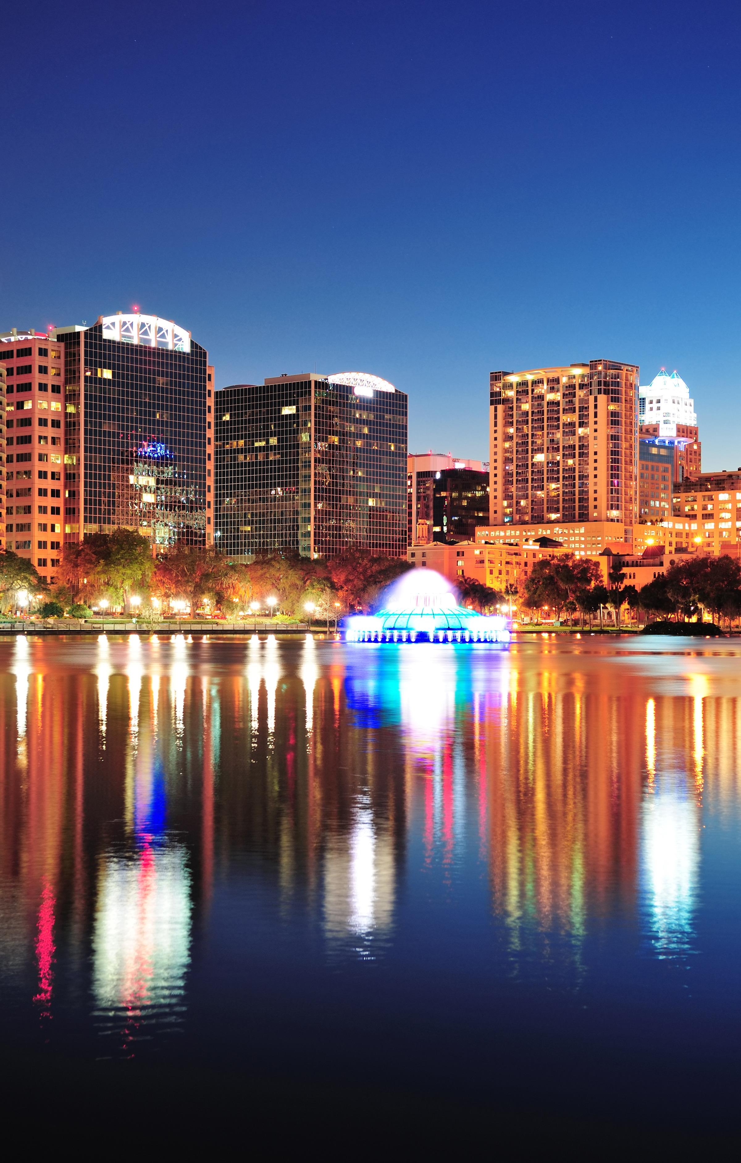 Orlando downtown skyline panorama over Lake Eola at night with urban skyscrapers, fountain and clear sky. ID: 32160