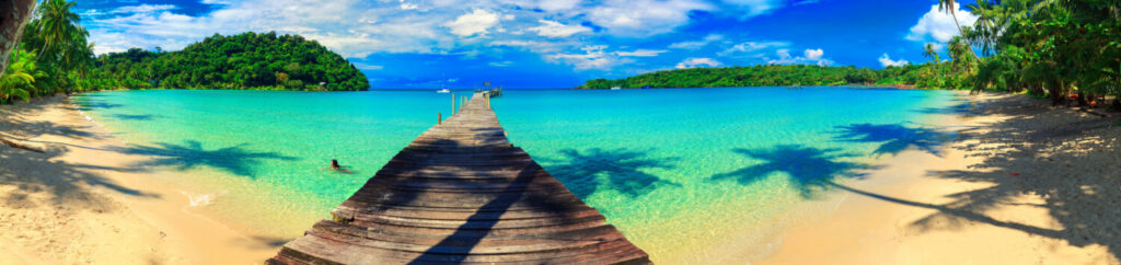 Paisaje panorámico natural: Playa tropical de arena de Panorama con palmera de coco de silueta en aguas cristalinas y un paisaje puente de madera fuera del horizonte / Playa tropical de palmera y palmera