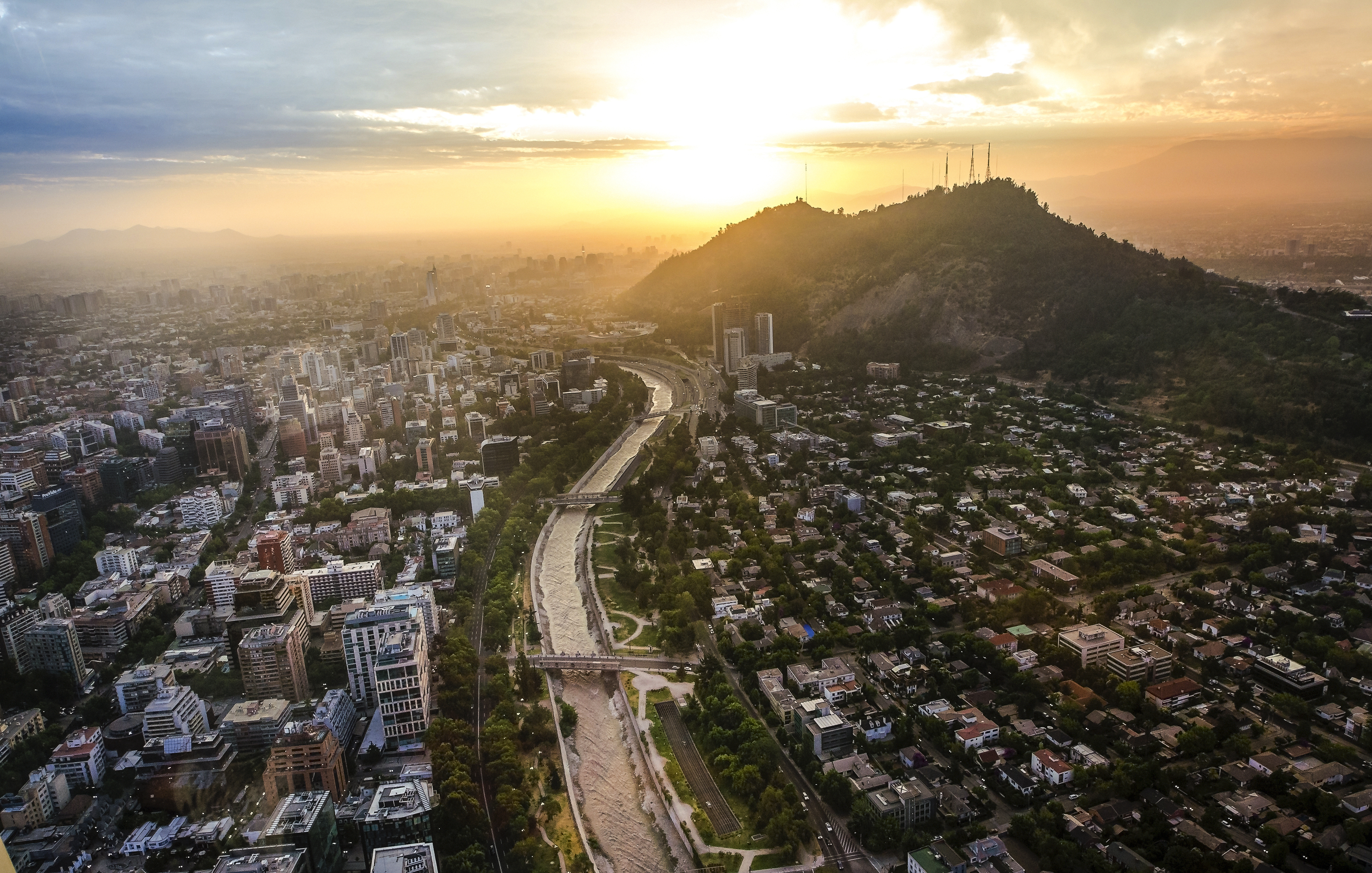 Paisaje urbano de Santiago de Chile al atardecer con el río Mapocho y Providencia
