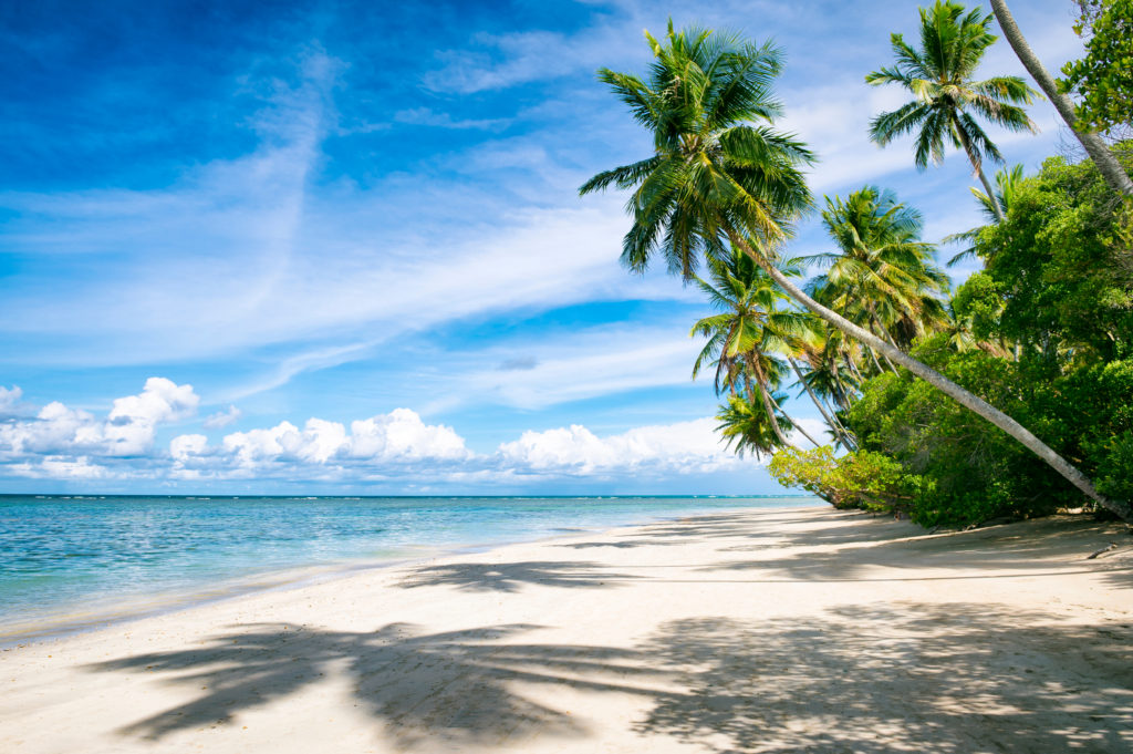 Palm trees casting shadows on a wide remote tropical Brazilian island beach in Bahia Nordeste Brazil ID: 31838