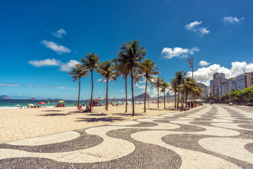 Palmas en la playa de Copacabana y la histórica acera de mosaicos en Río de Janeiro, Brasil.