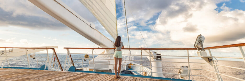 Pancarta panorámica de lujo de las vacaciones de la mujer en barco de crucero en cubierta. Viaje en Tahití en velero, destino exótico. Turismo en oceanía. Navegar en barco con destino a una escapada tropical