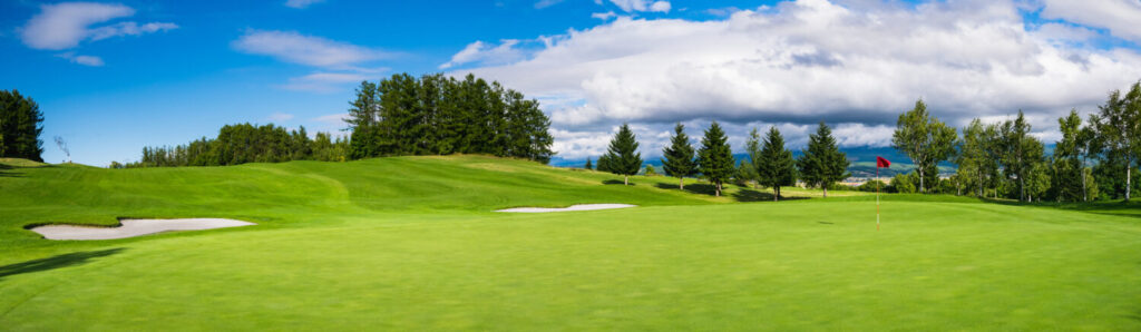 Panorama Vista del Campo de Golf con putting green en Hokkaido, Japón. Campo de golf con un rico paisaje verde.