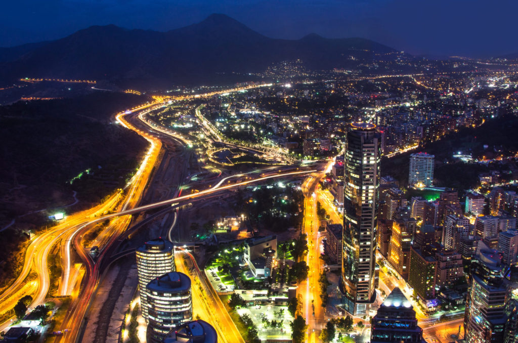 Panoramic night city view from the Gran Torre Santiago in Santiago de Chile.