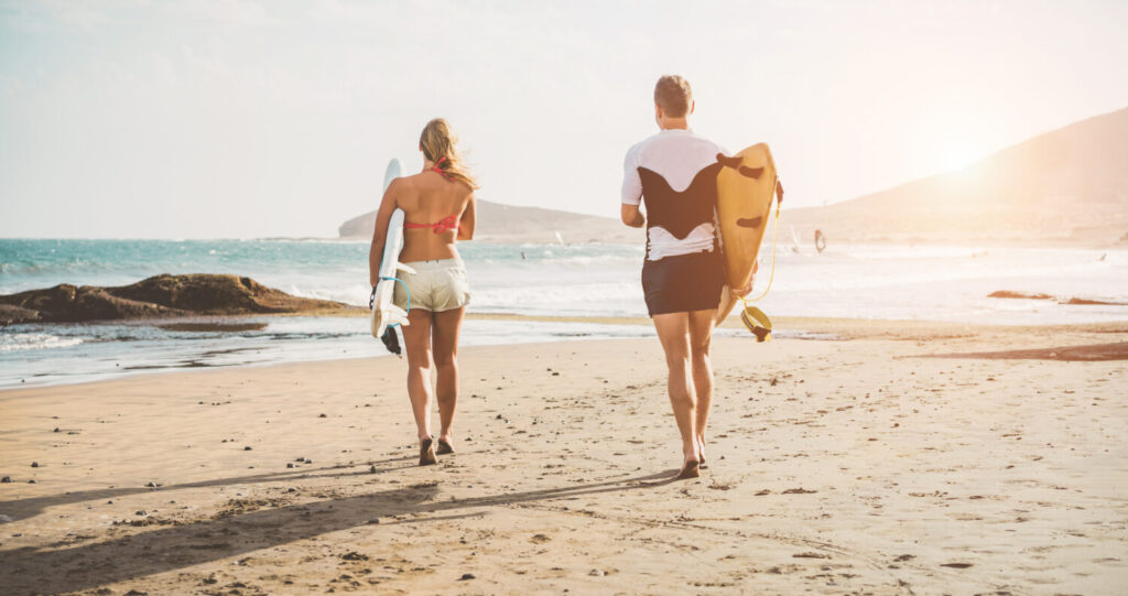 pareja de surfistas dentro del agua en la playa