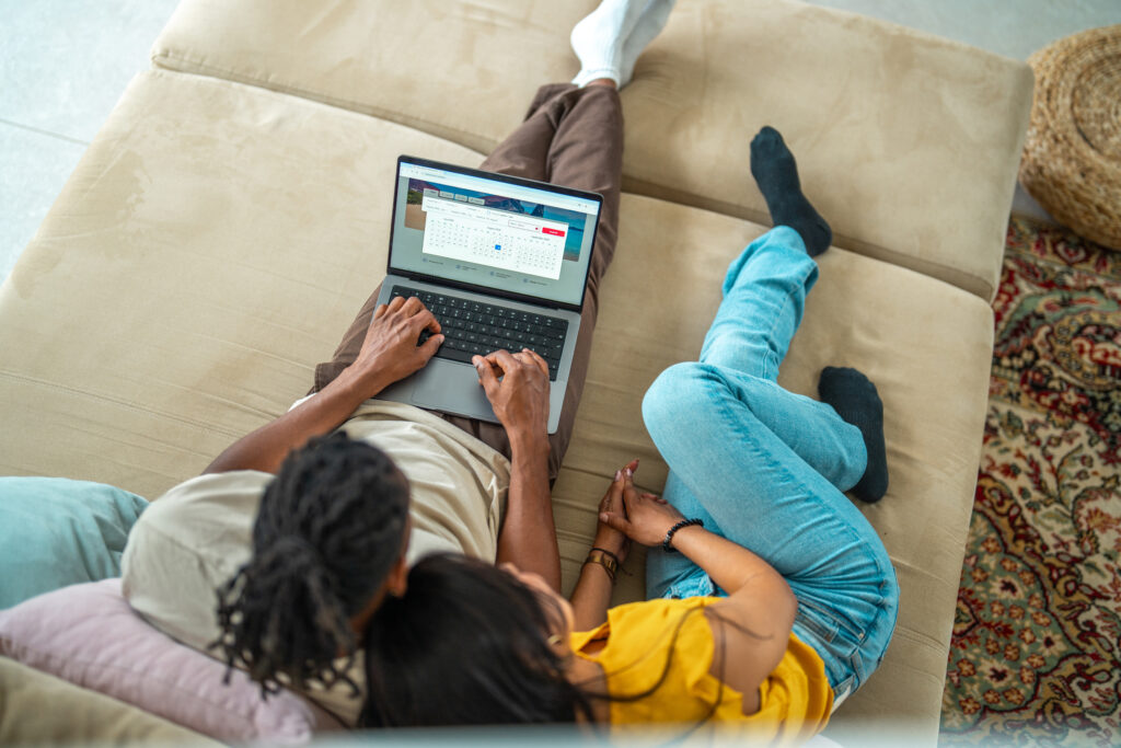 Pareja seleccionando reserva de vuelo Computador Getty 2