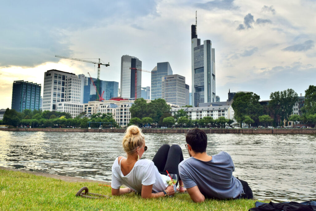 Pareja sobre hierba al borde del río Meno, con una vista perfecta del centro de Fráncfort por la noche [Verano] – Frankfurt, Alemania