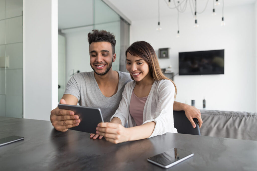 pareja usa tableta digital sentada en mesa en moderno apartamento