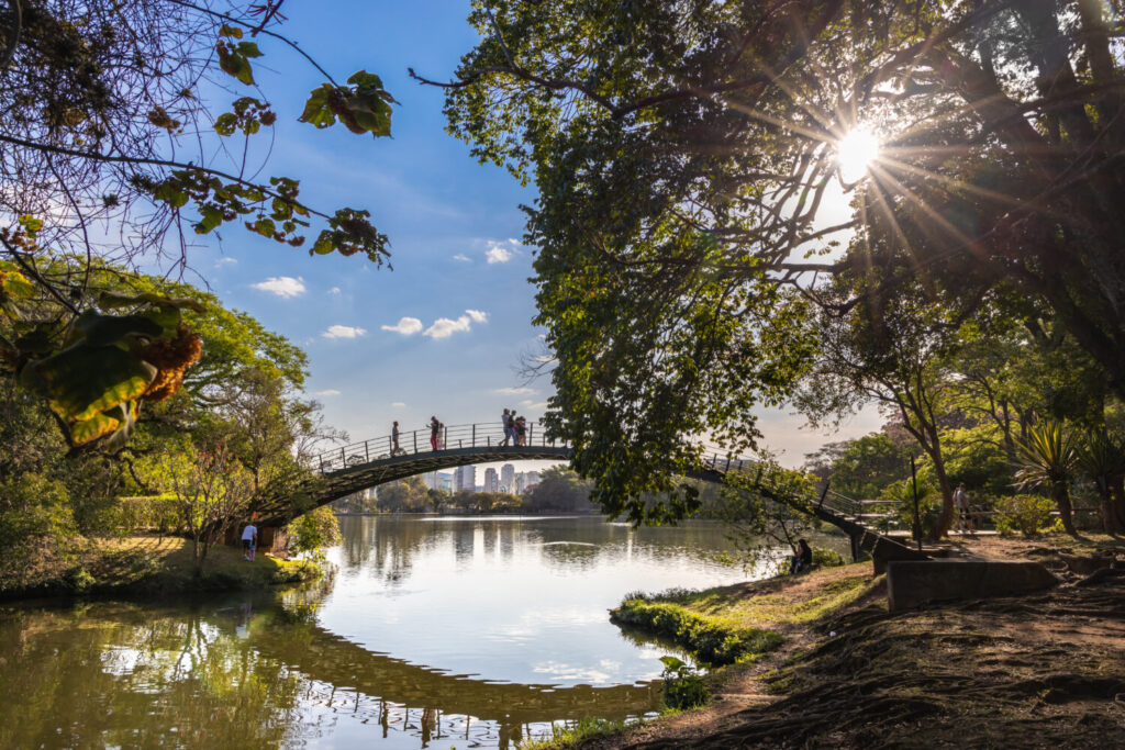 Parque Ibirapuera en la ciudad de São Paulo. Gente caminando en el puente que cruza el lago en el parque sobre una hermosa puesta de sol con el cielo azul y el sol brillando a través de los árboles. Un paisaje increíble