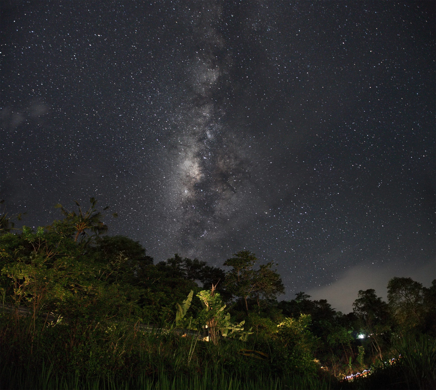 Part of a night sky with stars and Milky Way on equatorial latitude with green tropical trees below